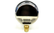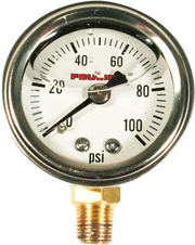 Quality liquid Silicone filled pressure gauge 1.5 dial with 0-100 range, stainless steel case with white or black dial face, glass cover, brass 1/8 NPT male bottom or back port. Gauges with 80% liquid filled arrangement, accuracy 3-2-3%.