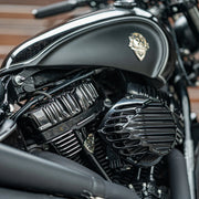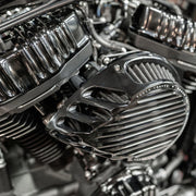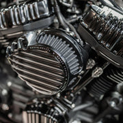 The Rough Crafts® Finned Air Cleaner features a smooth teardrop shape and sculpted CNC machined fins resulting in increased performance and style. Black anodized billet and the black performance air filter bring signature Rough Crafts® style to any machine